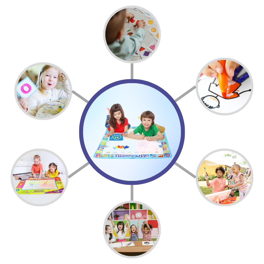 La versatilità del tappetino stimolante per scarabocchi ad acqua va oltre il semplice disegno. Grazie alla sua natura multifunzionale, può essere impiegato in una varietà di attività educative e ricreative, trasformandolo in uno strumento prezioso per l'apprendimento e il gioco. Genitori ed educatori possono utilizzare il tappetino per insegnare lettere, numeri, forme e colori, trasformando l'apprendimento in un'esperienza interattiva. È adatto anche per il gioco di gruppo, incoraggiando l'interazione sociale e il lavoro di squadra tra i bambini. Utilizzato a casa, in classe o all'aperto, il tappetino per scarabocchi ad acqua si adatta a diversi ambienti, fornendo una piattaforma multifunzionale per lo sviluppo e il divertimento dei bambini.